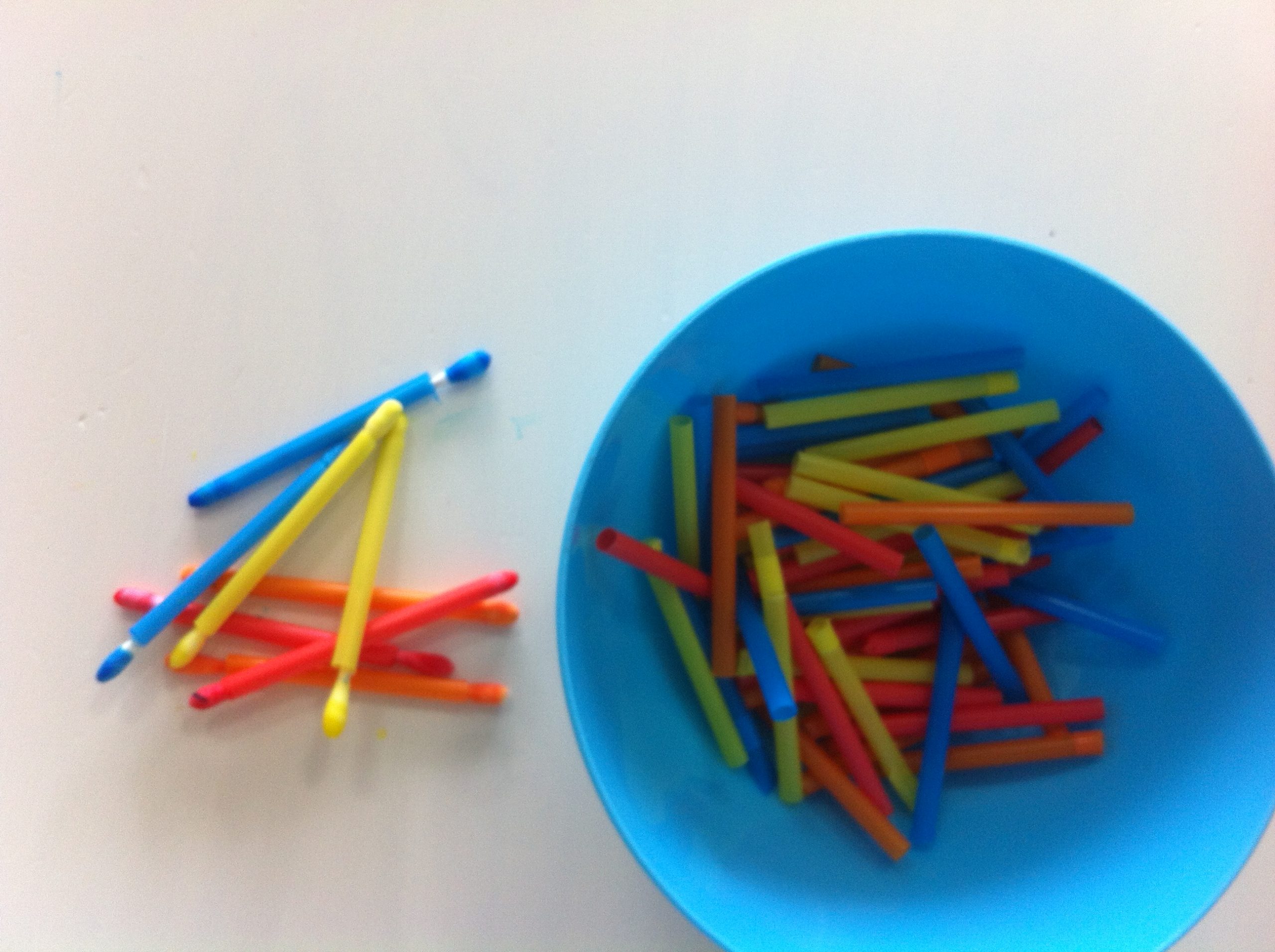 אם אתן רוצות לעבוד רק על המוטוריקה העדינה יש לגזור את הקשיות באורך כ4 ס"מ ולהניח בערימה אחת. אפשר גם לגזור יחד עם הילדים. כעת ניתן להשחיל את הקשיות לקיסמי האוזניים.