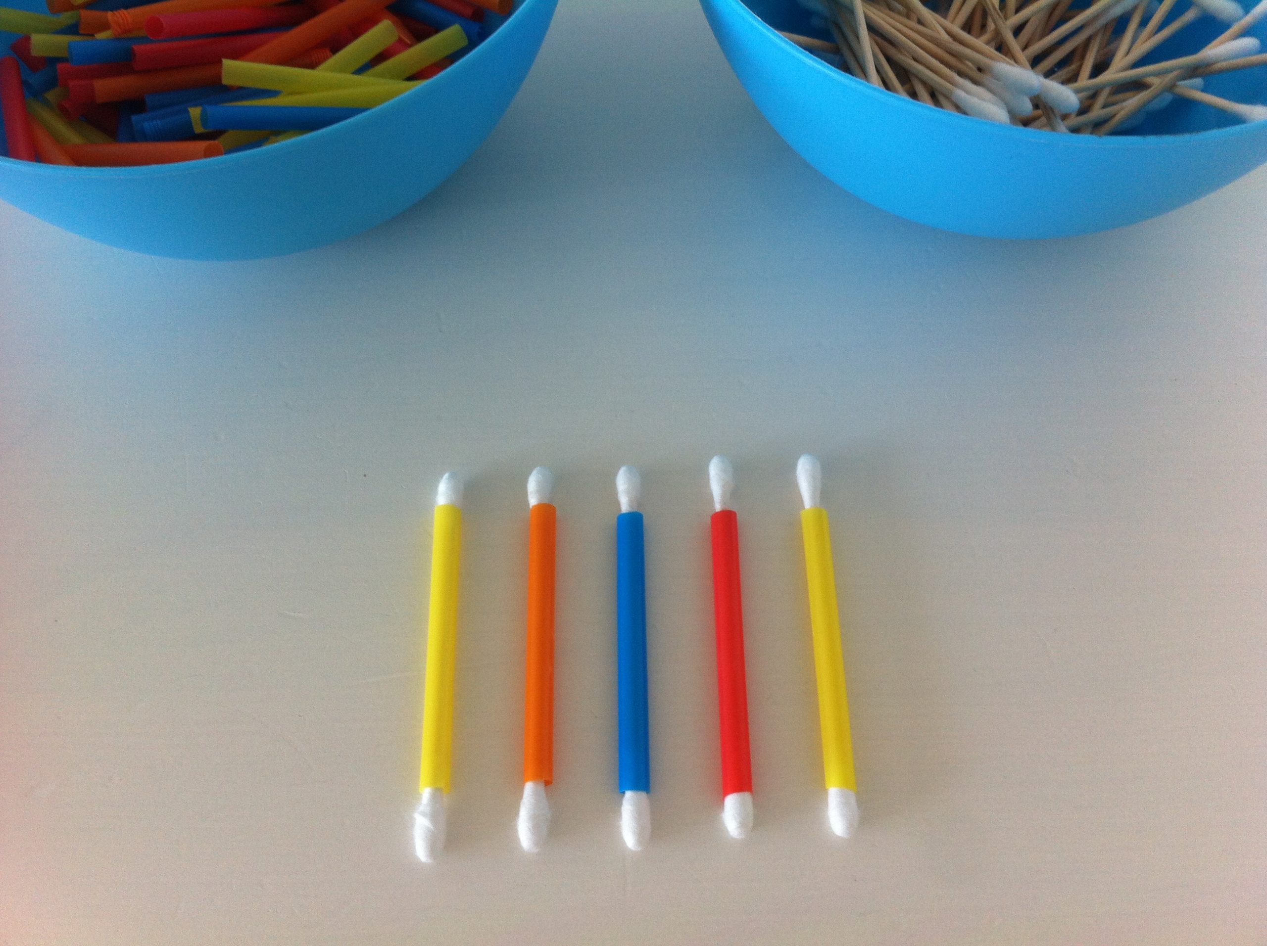 אם אתן רוצות לעבוד רק על המוטוריקה העדינה יש לגזור את הקשיות באורך כ4 ס"מ ולהניח בערימה אחת. אפשר גם לגזור יחד עם הילדים. כעת ניתן להשחיל את הקשיות לקיסמי האוזניים.