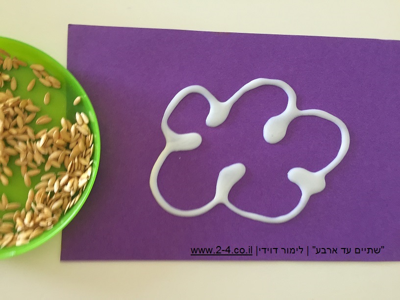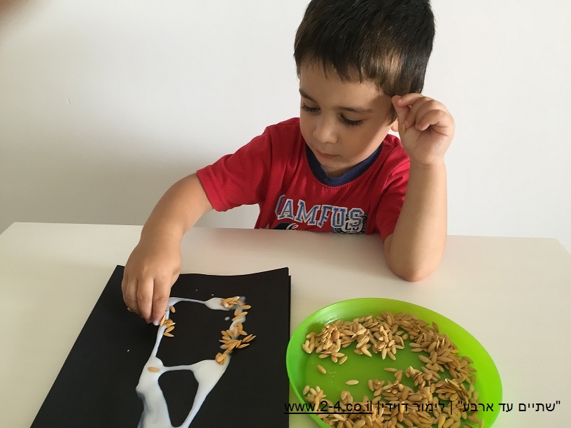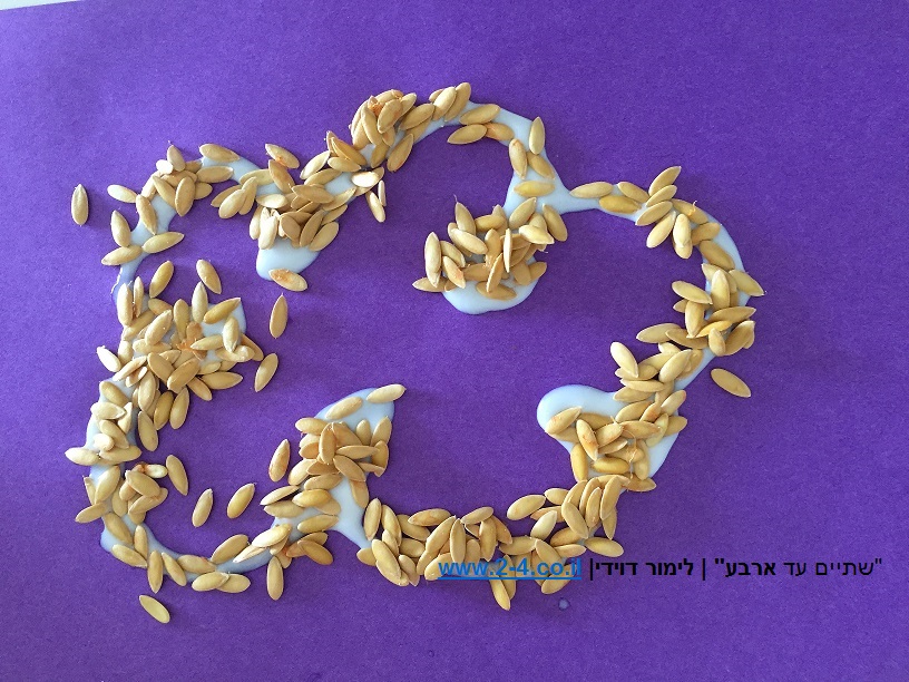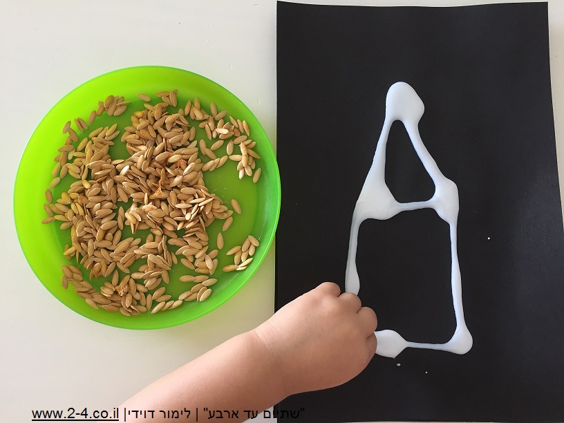 למרוח דבק או לצייר שבלונות עם הדבק והילדים ידביקו את זרעי המלון. ניתן גם ליצור פסלים מהזרעים, למרוח דבק על כל השבלונה גם מבפנים, למלא בזרעים, להוסיף עוד דבק ברווחים, ואחרי המתנה לייבוש מלא, יש לכם פסל מזרעי מלון.