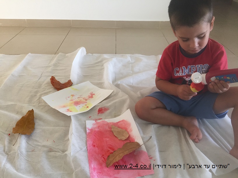 משחק עם צבעי ידיים ועלי שלכת, מגע של חומרים וכייף