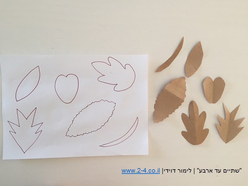 ציירו עלים בצורות שונות וגזרו אותם. בדף נפרד העתיקו את קווי המתאר של העלים שיצרתם. בקשו מהילדים להתאים את העלה לקווי המתאר. אפשר אפילו לקחת עלי שלכת ואמתיים להשתמש בהם, רק שלפני כדאי לשטח אותם בספר.