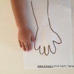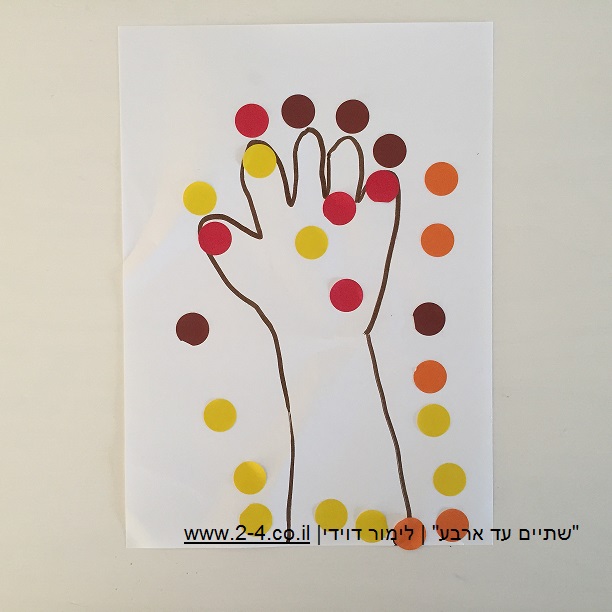 צירו בעזרת הטוש את קווי המתאר של היד (קצת יותר גדול). זה למעשה יהווה גזע העץ והענפים. בקשו מהילד בעזרת המדבקות להדביק את העלים שנושרים מהעץ.