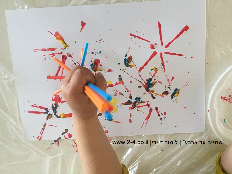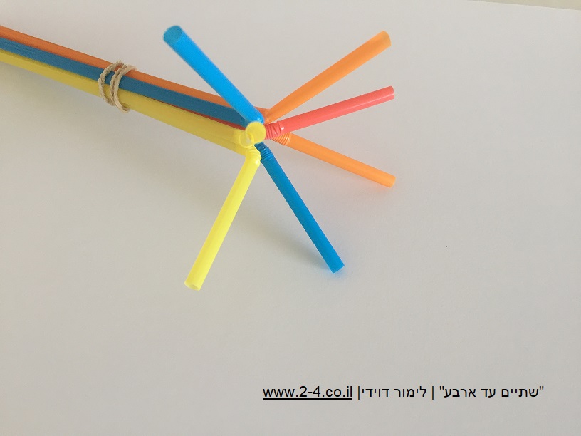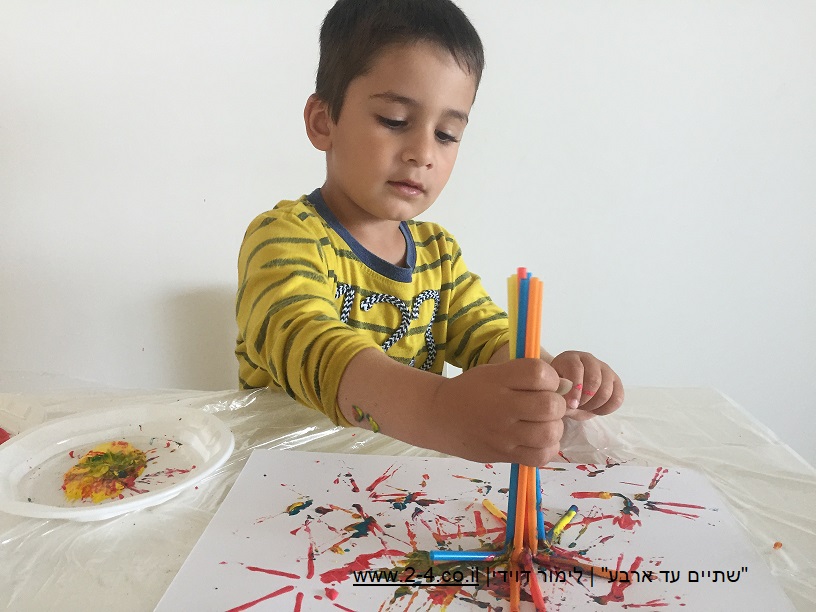 לחבר את הקשיות יחד בעזרת גומייה ולקפל את הקשיות באזור של האקורדיון לצדדים. עכשיו אפשר לטבול את הקשיות בצבעי הגואש וליצור לנו זיקוקים.