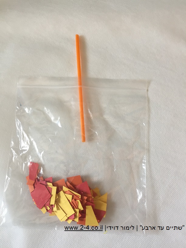 הילדים גוזרים את הרצועות לחתיכות קטנות. מכניסים לשקית, ומוסיפים את הקשית. סוגרים את שקית הזיפ משני הצדדים ועכשיו אפשר לנשוף ולהעיף את החתיכות.