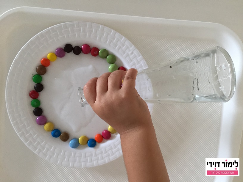 יש לסדר במעגל את הסוכריות. אפשר לערוך כמה ניסויים- לסדר שורה אחת, שתי שורות, לפי צבעים ועוד. שופכים במרכז מעט מים. ככל שהמים חמים יותר- הניסוי ייערך מהר יותר. בגלל שמדובר בילדים בגיל הרך, עדיף מים חמימים. גם מים קרים, יעשו את העבודה- רק שזה ייקח יותר זמן. הצבע יורד מן הסוכריות ונוצרת קשת של צבעים אך הצבעים לא מתערבבים.