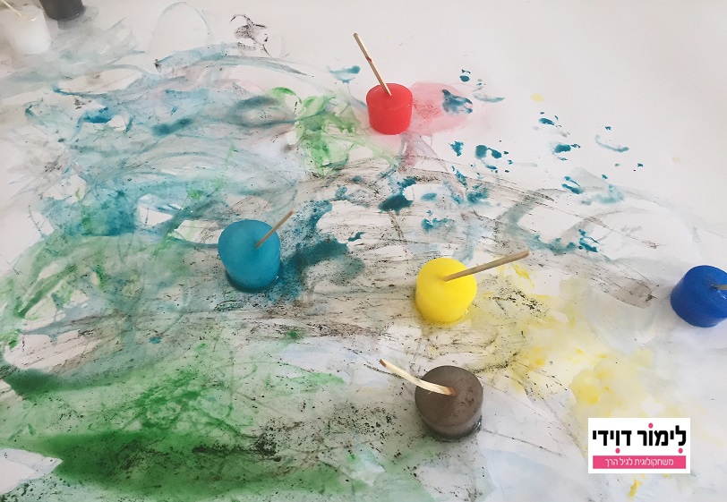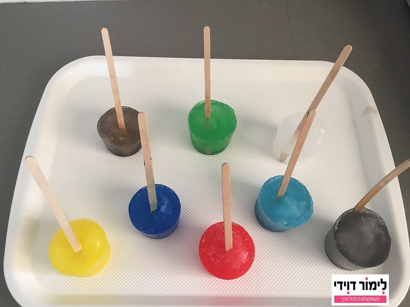 הפעם אנחנו צבענו עם גואש בכוסות פלסטיק עם מקלות ארטיק. הקפאנו וקילפנו את הצבעים.